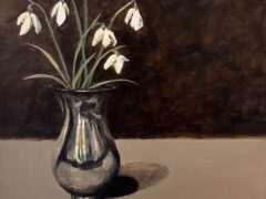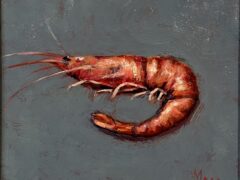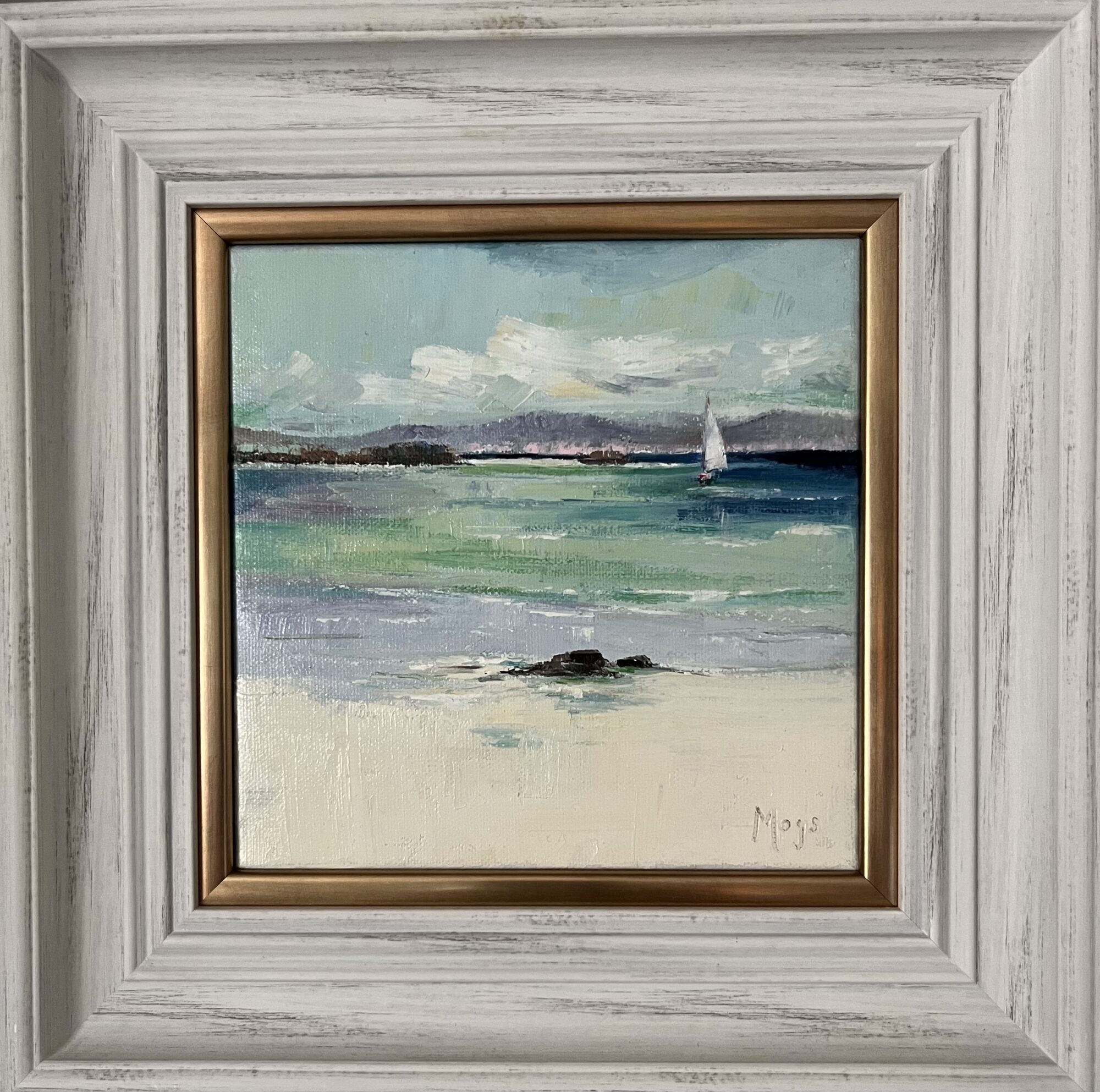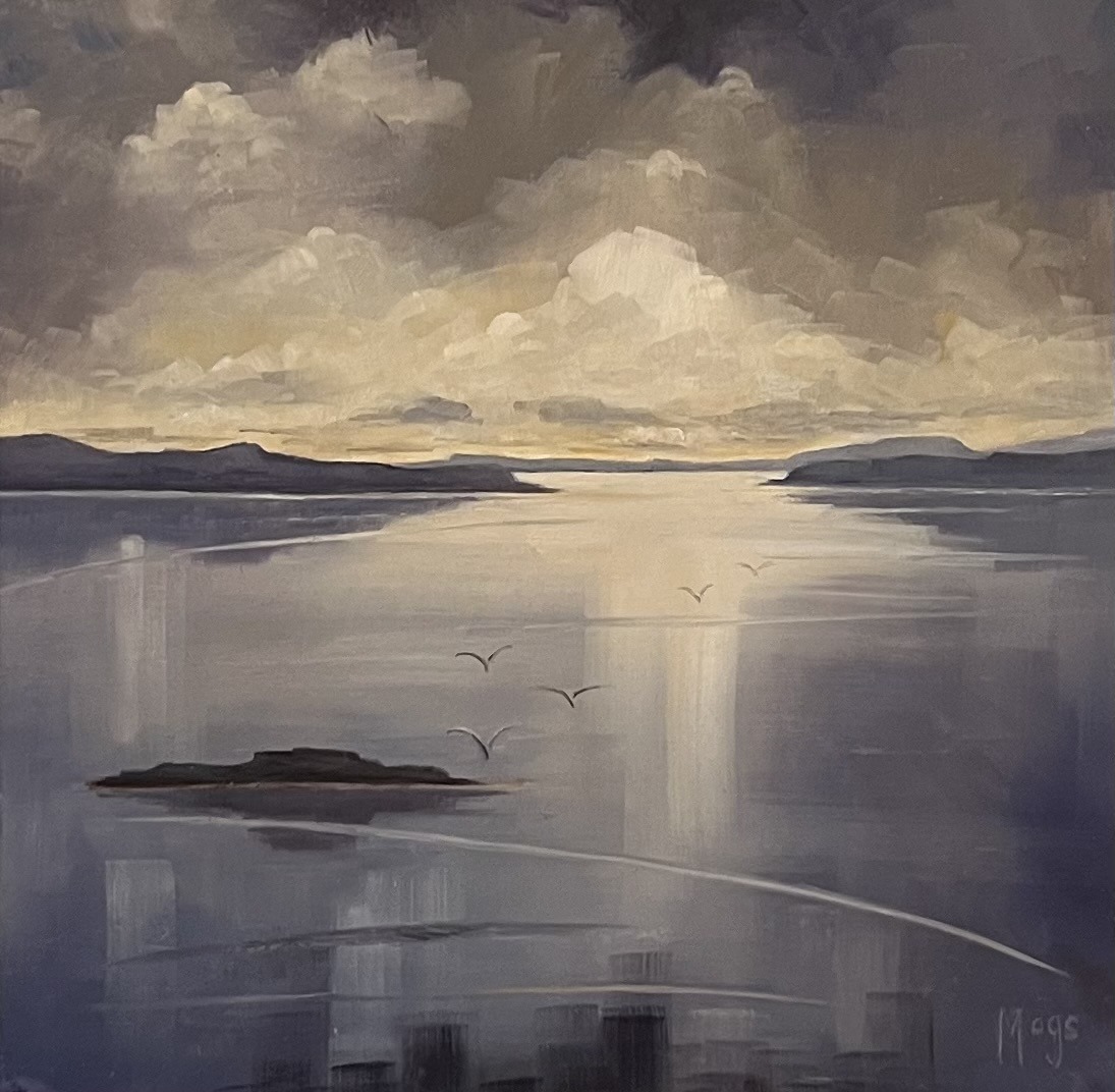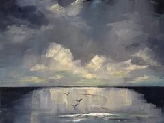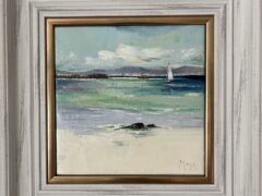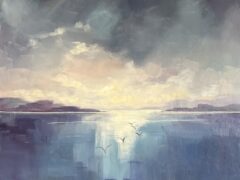 Her studio is at the family farm overlooking the sea inspiring her to paint what catches her eye: oystercatchers, boats, flowers, a sprat on blue plastic, and little silver jugs . She calls her best work “happy accidents.” What moves her most is when a stranger walks in and says: I love this.