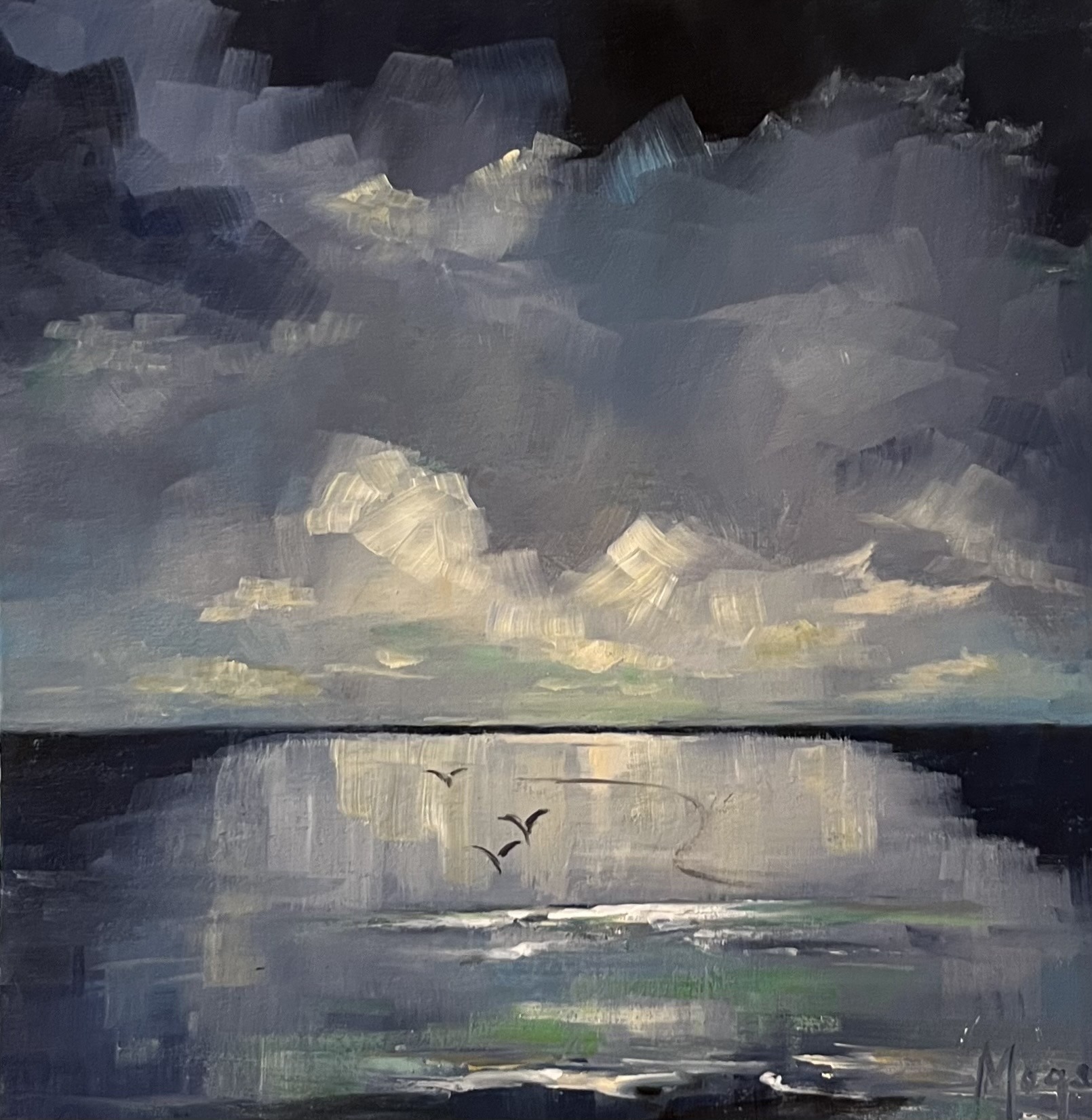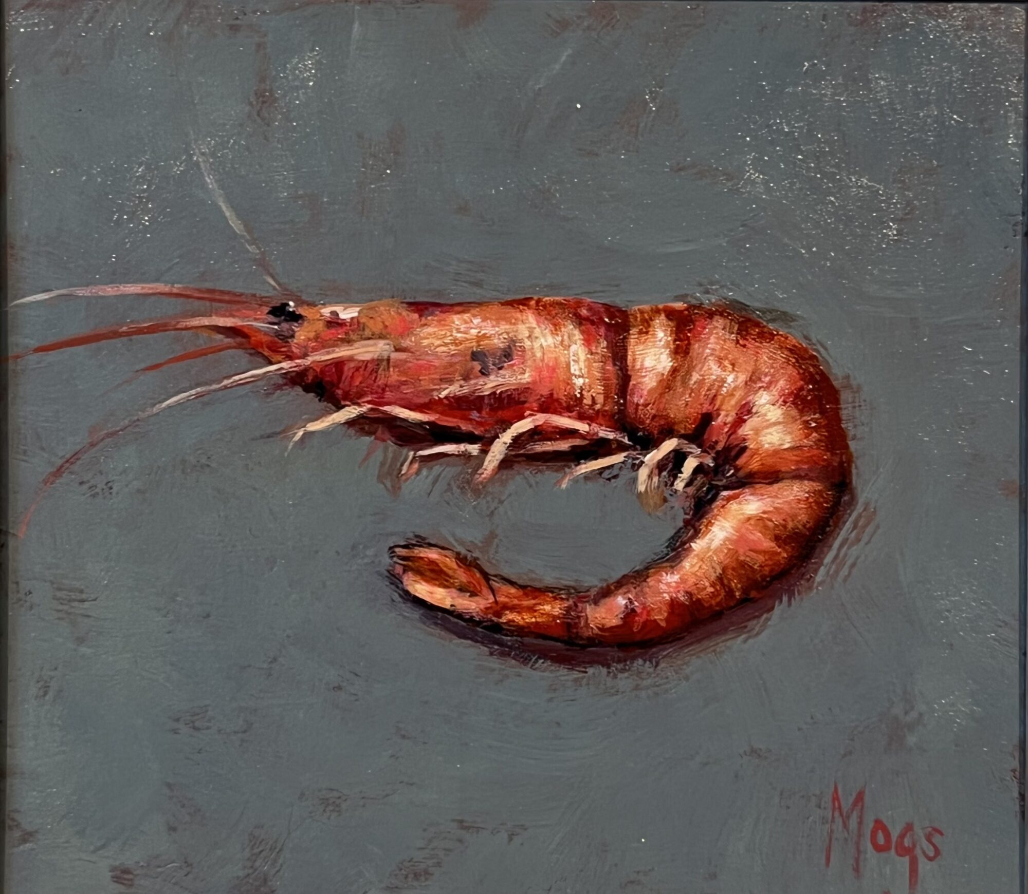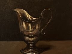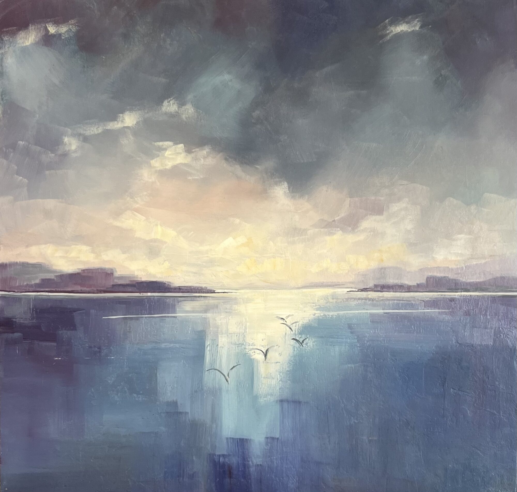 Her studio is at the family farm overlooking the sea inspiring her to paint what catches her eye: oystercatchers, boats, flowers, a sprat on blue plastic, and little silver jugs . She calls her best work “happy accidents.” What moves her most is when a stranger walks in and says: I love this.